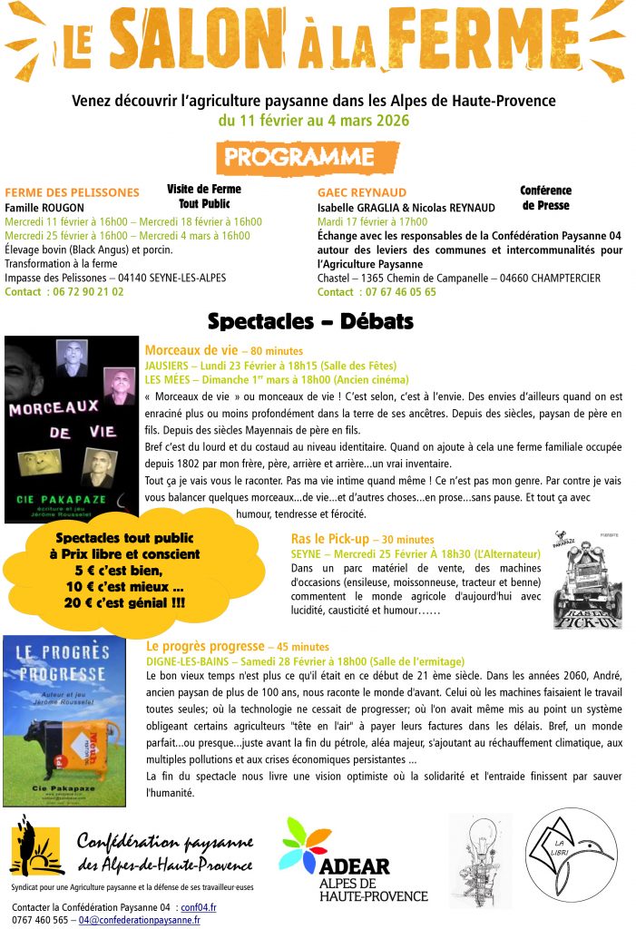 Le Salon à la ferme » vous invite à découvrir l’agriculture paysanne dans les Alpes de Haute-Provence, avec visites à la ferme, spectacles, débats… jusqu’au 4 mars.